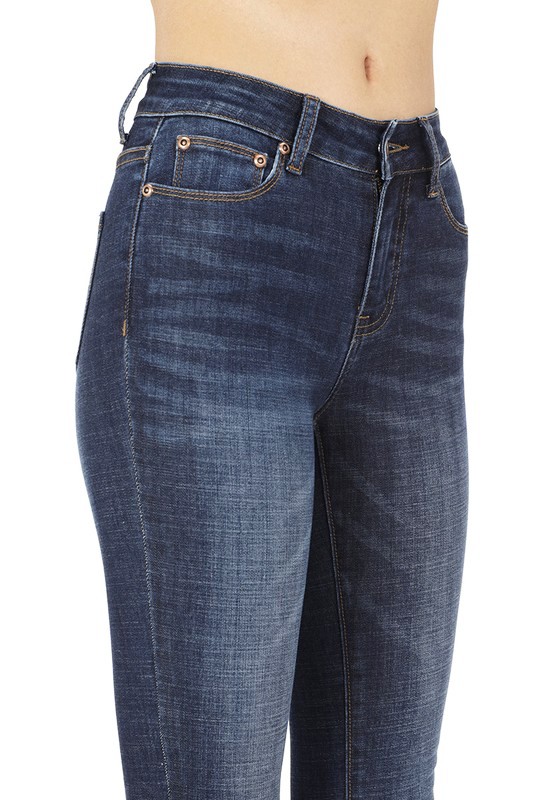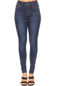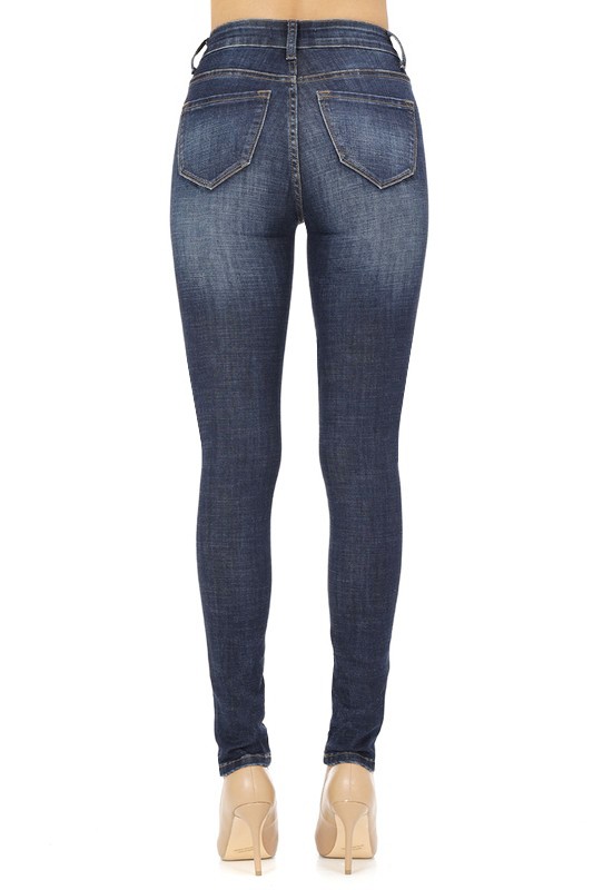 Mid Rise Dark Blue Skinny Jeans In beautiful dark stone wash stretch denim with soft fading and whiskers. Basic 5 pocket style with contrast top stitching, zip fly, and button closure.