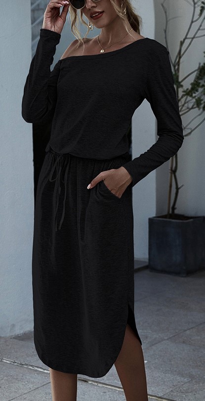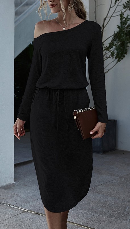 Black long sleeve one shoulder dress. This midi dress is the comfy essential we’ve been dreaming of! A perfectly oversized bodice falls to drawstring waist and scalloped hem.