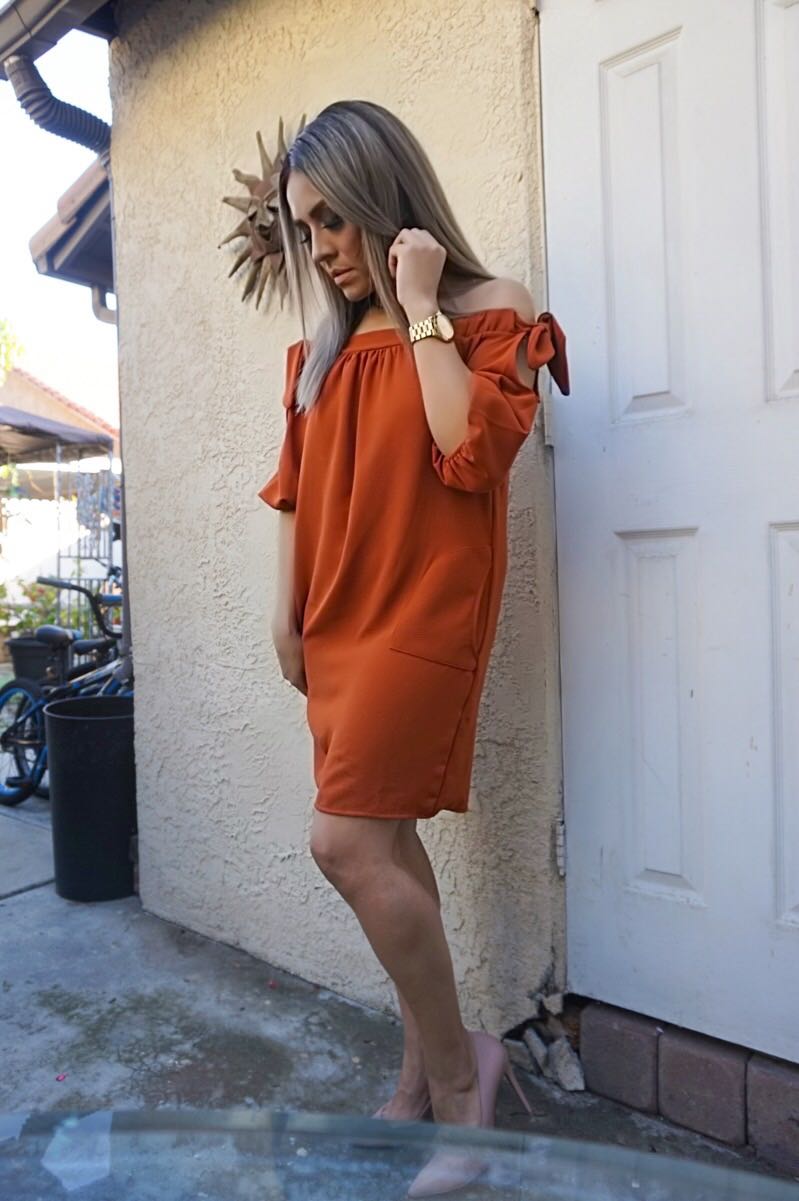 A Woven Shift Dress Featuring An Off-The-Shoulder Elisticized Neckline with Self-Ties, And two side pockets. Can be worn with pumps or sandals.