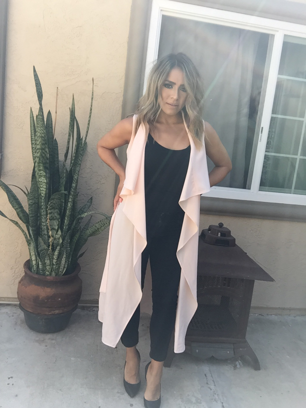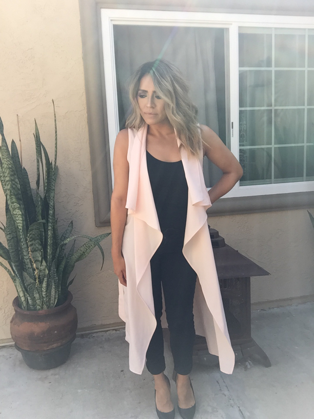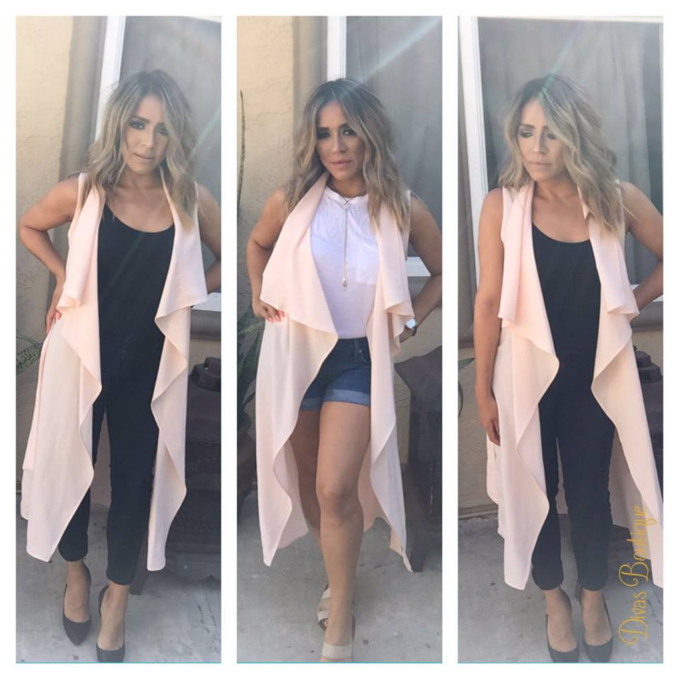 A long-line woven vest with a drapery front style, can be worn with Jeans, dresses or dressy pants, your choice. Removable self-tie sash belt.