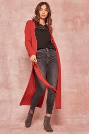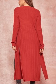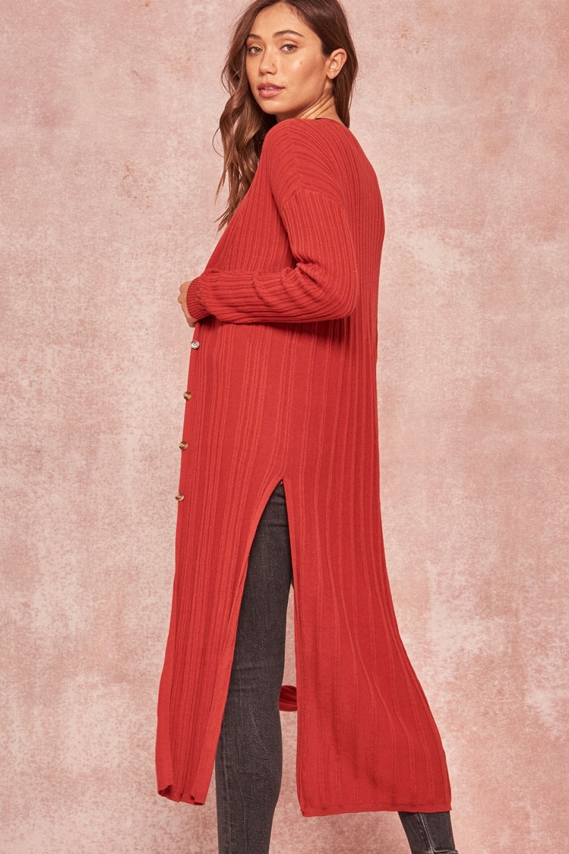 A ribbed knit cardigan sweater with a fitted, longline design. This calf-length cardigan features side slits and a buttoned front closure with tortoiseshell buttons